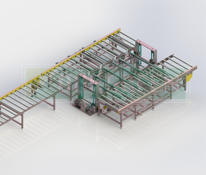 南京歐格設(shè)計(jì)制造的后續(xù)自動(dòng)化生產(chǎn)線(xiàn)使用機(jī)械推手將板材推入碼垛堆疊,堆疊成包裝要求高度,輸出打包。